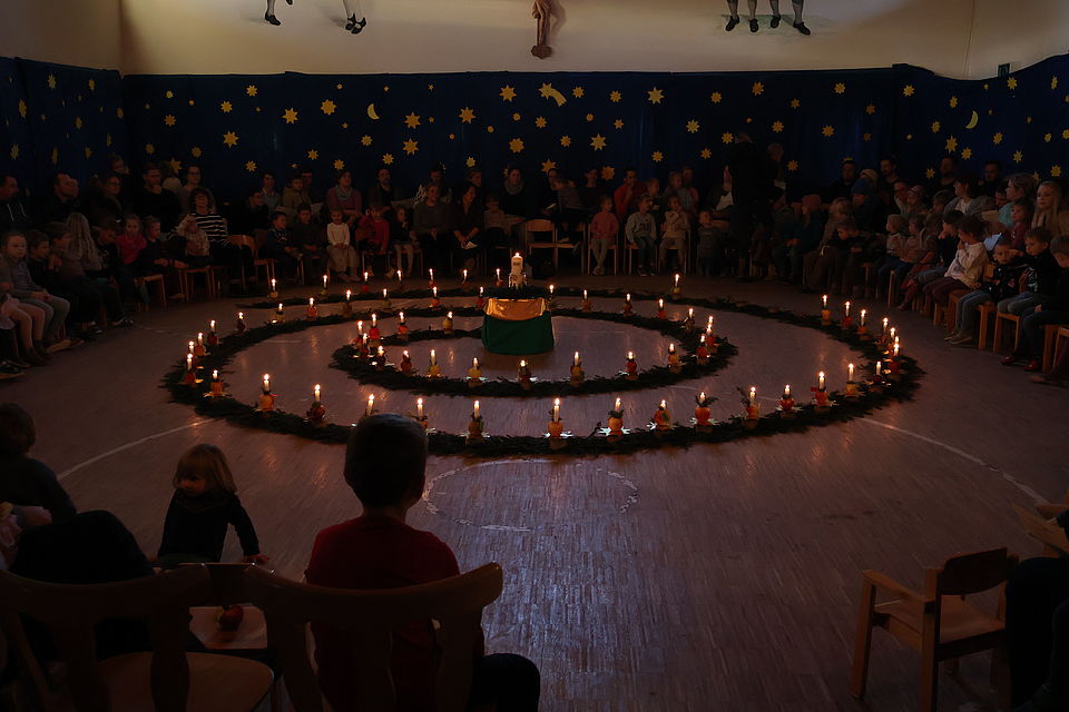 Am Freitag, den 28.11.2025, gab es im BRK-Kinderhaus Baiern ein Adventsgärtlein, welches aus der Waldorfpädagogik bekannt ist. Dies ist eine meditative und stimmungsvolle Einheit, die die Möglichkeit bietet, sich gemeinsam auf die Adventszeit einzustimmen. Die Kinder entzünden ihre Apfelkerze an einer großen Weihnachtskerze im Inneren einer Tannenzweig-Spirale und tragen es „hinaus in die Dunkelheit“. Bei uns tragen die Kinder die Apfelkerze zurück in die dunkle Tannenzweig-Spirale, stellen ihre Kerze auf einen bereitstehenden Stern in der Spirale, so dass sie auf diese Weise bis zum Ende heller und heller leuchtet. Begleitet werden die Kinder auf ihrem Weg mit einem Flöten- und Gitarrenspiel. Zum Abschluss singen alle gemeinsam das Lied: „Seht die gute Zeit ist nah…“.