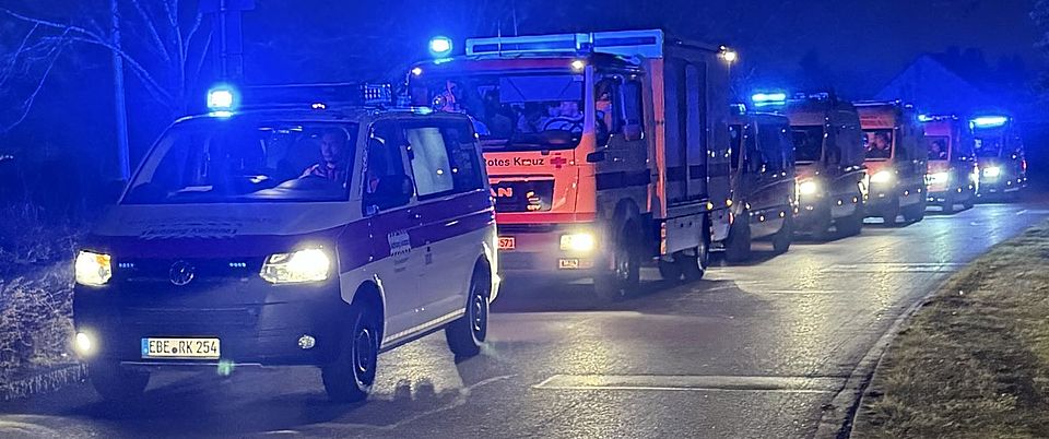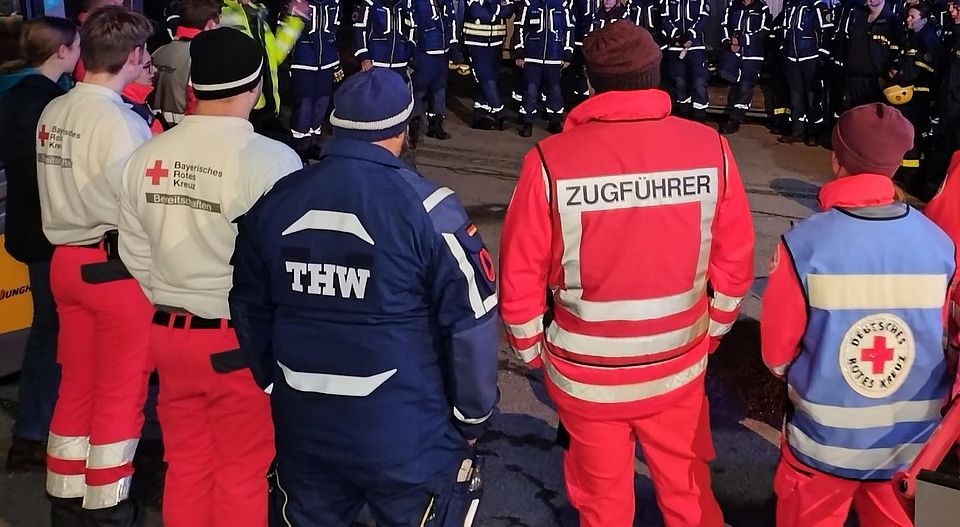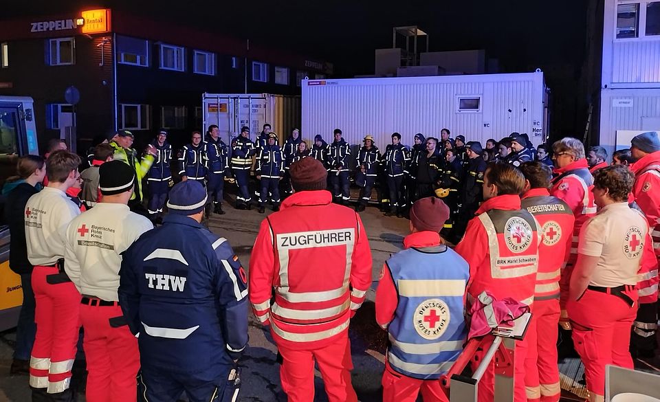 Nach der Alarmierung sammelten sich die verschiedenen BRK-Einheiten mit 24 Einsatzkräften der BRK-Bereitschaften in Poing auf einem Parkplatz. Von dort aus wurde im geschlossenen Zugverband in einen Bereitstellungsraum im Nachbarlandkreis verlegt. Kurz darauf erfolgte der Abruf ins angenommene Schadensgebiet.