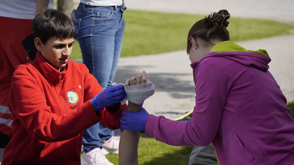 Um 9 Uhr wurde fleißig aufgebaut, so dass um 10 Uhr die Teilnehmer mit den Übungen starten konnten. In fünf Fallbeispielen, welche vom RUD-Team realistisch geschminkt wurden, konnten die Kinder und Jugendlichen von kritischen Blutungen, über Unterkühlungen bis hin zu einem Fahrradunfall alle wichtigen Erste-Hilfe-Maßnahmen gemeinsam im Team durchführen.