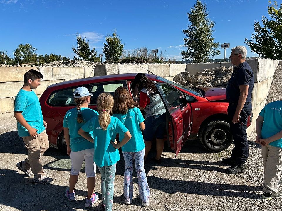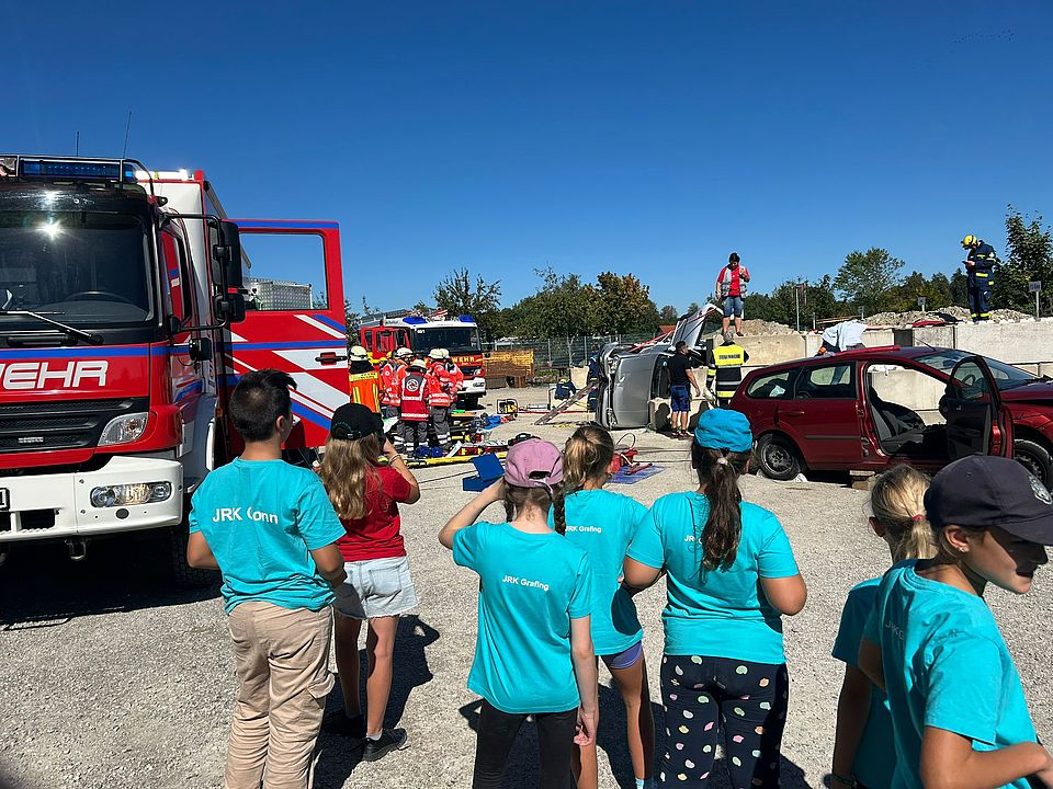 Auf Einladung der FFW Grafing nahm das JRK Grafing vergangenes Wochenende am Kreisjugendfeuerwehrtag teil. Die Kinder erfuhren von Lore, der Leiterin des RUD-Teams (Team der Realistischen Unfalldarstellung), wie Übungsszenarien aufgebaut und dargestellt werden und konnten hautnah erleben, wie die Mimen geschminkt wurden. Bei der Übung, ein Verkehrsunfall, konnte das JRK Grafing zusehen und der FFW, dem THW und der Bereitschaft Grafing mit Rettungswagen und Hefer vor Ort über die Schulter schauen. Zum Abschluss gab es noch ein leckeres Essen in der Stadthalle Grafing. Die Kinder waren von dem Tag sehr begeistert und mussten mit Erstaunen feststellen, wie lange es eigentlich dauert, bis drei Personen aus einem Fahrzeug befreit werden können.