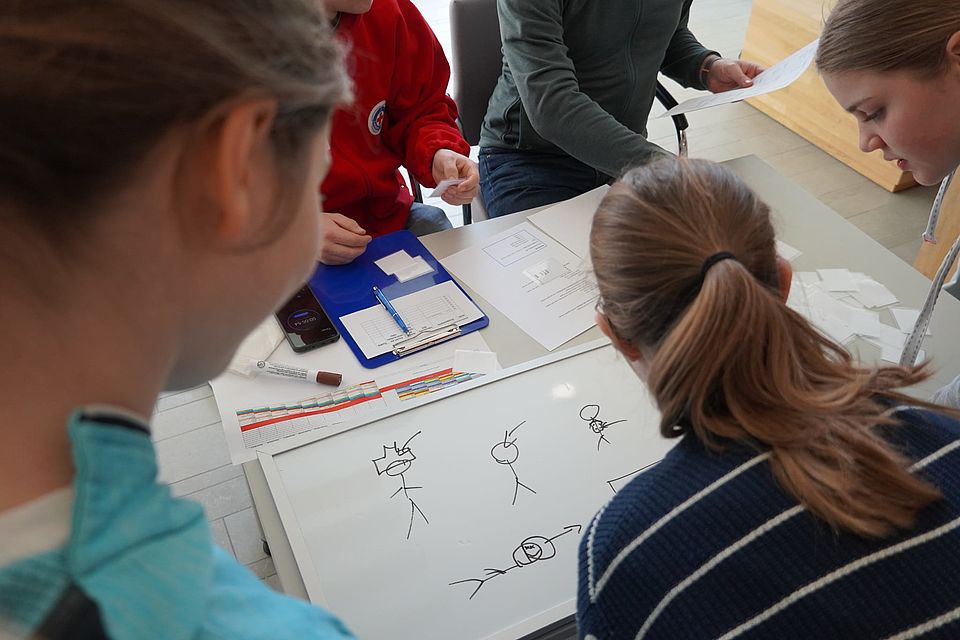 Das Organisationsteam aus den Kreisjugendleitungen hatte bereits am Vorabend fleißig aufgebaut, so dass die Mannschaften am Samstagmorgen entspannt in Freiham anreisen konnten. Nach einer gemeinsamen Begrüßung ging es für die Jüngeren (Stufe 1: 8-10 Jahre und Stufe 2: 11-13 Jahre) ins Hallenbad zu den Schwimmdisziplinen. Hier wurde als Mannschaft, die jeweils mit vier bis sechs Teilnehmenden besetzt ist, um die Wette geschwommen, getaucht und gerettet. Zeitgleich durften sich die „Großen“ (Stufe 3: 14-16 Jahre) an den Theorie-, Spiele- und Praxisstationen an Land beweisen. Dabei wurden Fragebögen zu den Themen Erste Hilfe, Wasserwachtwissen „Ertrinken vermeiden“ und A-Z „Wasserwacht - mehr als Schwimmen“ bearbeitet. Außerdem galt es, die Grundsätze des Roten Kreuzes richtig zu benennen und zu erklären, und selbstverständlich Verletzte eines Fallbeispiels mit Erster Hilfe zu versorgen. Das Team der Realistischen Unfalldarstellung schminkte und spielte die Verletzten eines Fahrradunfalls. Die Teilnehmenden versorgten diese Mimen fachmännisch; vom Auffinden, über den Notruf bis hin zur Versorgung der Verletzten. Zur Auflockerung gab es Spielstationen, an denen ein Film zum Schutzkonzept gedreht wurde, den anderen Teammitgliedern Rot-Kreuz-Begriffe erklärt werden und gemalt werden mussten und ein Ei so eingepackt werden sollte, dass es den Sturz aus dem 1. Stock überlebt.
