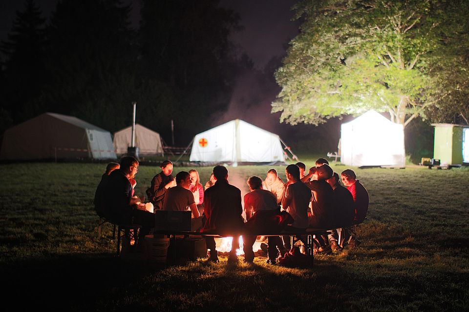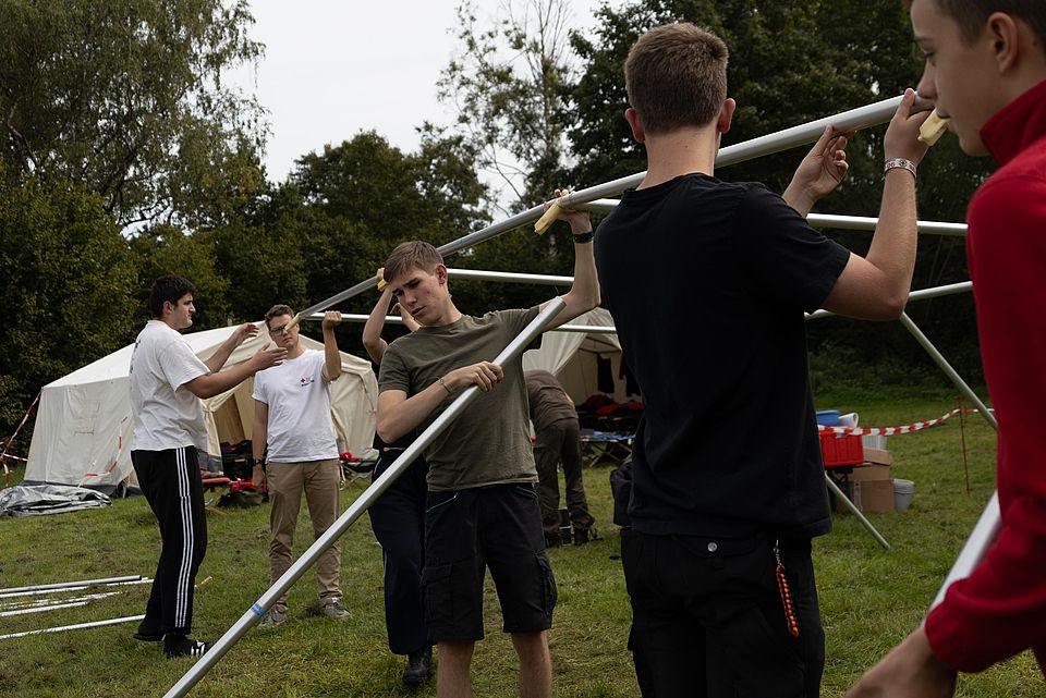 Fünf Tage lang tauschten die vier Jugendrotkreuz-Gruppen aus Markt Schwaben ihr gewohntes BRK-Heim gegen ein Zeltlager in der Jugendsiedlung Hochland bei Geretsried/Königsdorf. Untergebracht in großen Katastrophenschutzzelten, die erstmal im Regen aufgebaut und eingerichtet werden mussten, erwartete die Teilnehmenden ein abwechslungsreiches Programm mit Ausflügen, Spielen, Lagerfeuer und Rotkreuz-Inhalten.